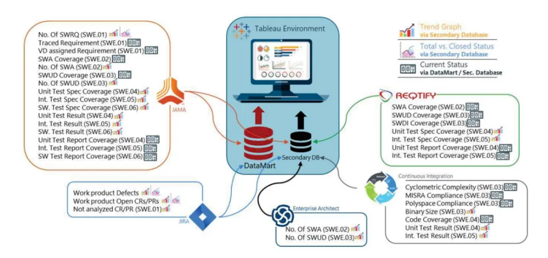 在当今世界,要成功运营任何组织,理解数据至关重要。即使是最懂数据的人,也可能难以处理随时可用的大量信息。要做出基于ASPICE数据的决策,需要找到最关键的事实,并以易于理解的方式组织它们。使数据对技术和非技术用户都易于理解的最简单方法之一是创建一个仪表板,将所有数据可视化方便地显示在一个位置。如果在仪表板可以显示数据之前,必须手动从一个平台导入、导出和转换数据,那么数据将会过时。这往好里说会导致效率低下,往坏里说会导致错误的假设和严重的决策失误。因此,找到一个能够实时收集和呈现所有必要数据的自动化系统,作为用户的快速准确参考,是非常重要的。
