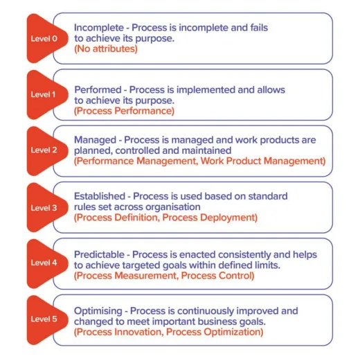 · 1级:已执行级。该过程已实施并达到其预期目标。此时,组织可以在很大程度上或完全交付标准要求,尽管其过程中可能仍存在一些差距。