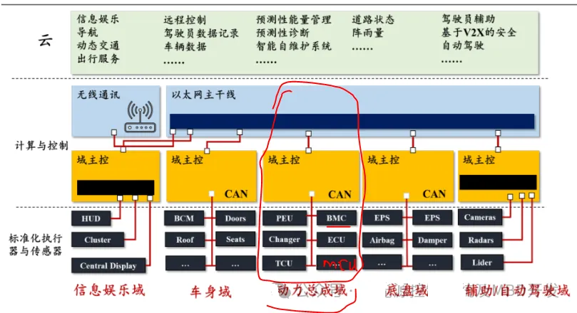 之前的文章,讲解目前三电领域比较常用的CP Autosar如何与Simulink进行建模的耦合,但随着域控制器的发展,动力域控也逐渐向集中式发展,如下图所示: