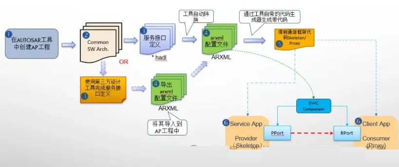 服务接口定义:使用ARXML(AUTOSAR XML)定义服务接口(如SOME/IP的Service