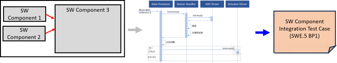 ② 依据软件架构设计中SW Component间的交互,进行的SW Component集成测试 (映射到SWE.5 BP1, BP4)