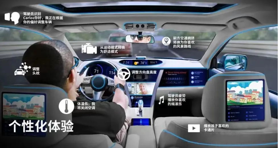 车载智能座舱包罗万象,与用户的视觉、听觉、触觉、甚至嗅觉等多种人体感知都有交互;可以为用户提供导航、娱乐、游戏、驾驶控制等多种不同功能体验;在智能座舱内,用户可以控制座椅、氛围灯、车门、车窗等车内甚至车外的各种车身设备单元;通过车内车外网络互联可以为用户提供上网、无线控车、娱乐设备间的内容无缝流转等各种服务;另外,智能化方面,可以提供智能识别、智能配置等等符合用户个性化的智能服务。