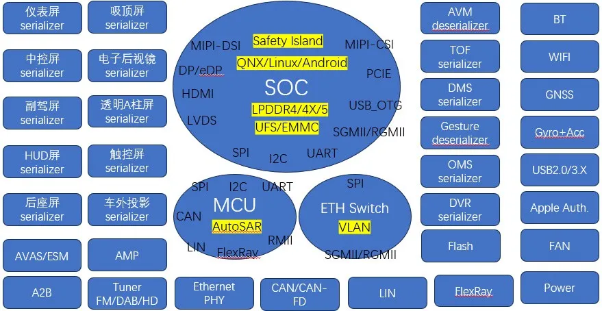 谈到智能座舱系统,首先想到的就是智能座舱域控制器,它在智能座舱系统中处于核心地位。下图大体列举了智能座舱的核心控制器,及其上面运行的操作系统、最小系统及核心芯片,以及智能座舱功能涉及到的外围周边件类别,以及通信总线等等。