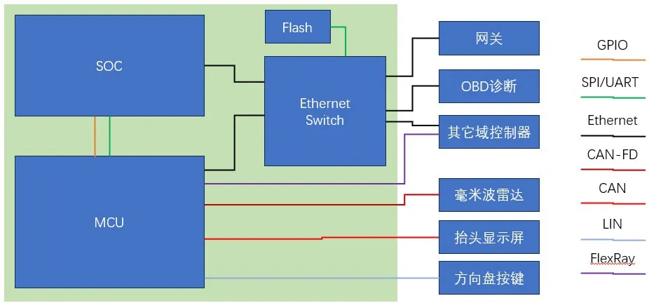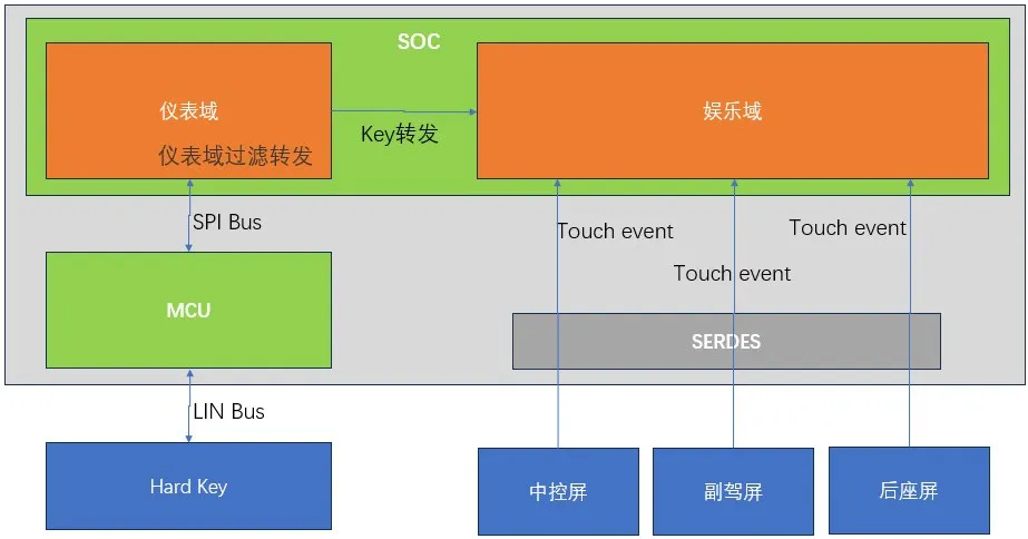 下图为触摸屏的Touch功能从方向盘按键采用LIN总线输入给座舱域控制器,在座舱域控制器内从MCU发送给SOC,在SOC内部仪表域再转发给娱乐域应用。