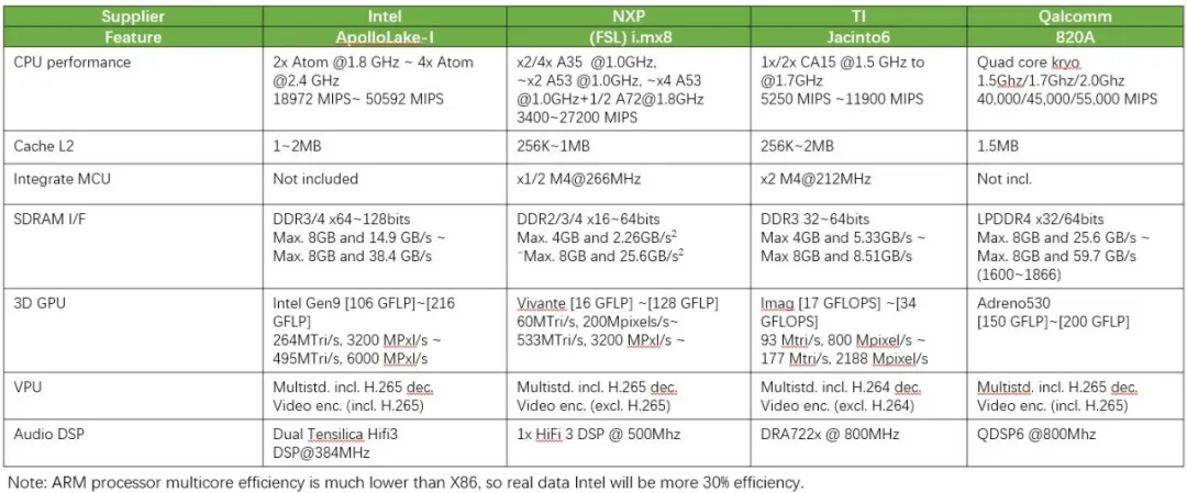 高通从820A开始逐渐打开市场;Intel以Apollo Lake进军汽车座舱领域,但后来并未形成规模便逐渐退出汽车领域;TI的Jacinto6一度风头无两;NXP的IMX6/8系列梯度覆盖高中低端车型。