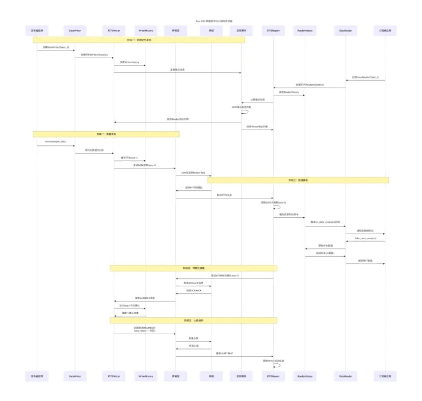 Fast DDS 的核心工作流程围绕数据发布与订阅展开,体现了各模块的协同作用。整个流程可以分为创建初始化、发现匹配、数据传输和可靠性保障四个阶段。