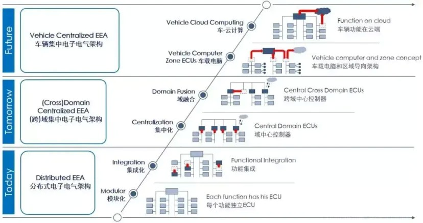 随着汽车中新的用例和技术的引入,车辆的电气/电子架构正在发生根本性变化,如下图。