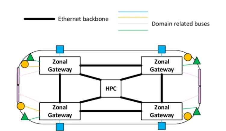- 车载网络正从功能逻辑分布转向物理区域分布。该架构由多个区域网关控制器组成,这些控制器处理与一个物理区域的传感器和执行器的通信,组合每个设备所需的网络协议。同时,这些区域网关通过以太网骨干网彼此连接,并与中央