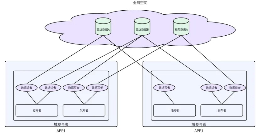 DDS号称是唯一的以数据为中心的通信中间件,OMG把以数据为中心这个特征看成一个重要的特点。DDS把系统的数据按照主题组织在“全局数据空间”,不同的应用通过发布者以及订阅者去读写全局数据空间的数据,值得注意的是这个全局数据空间只是一个逻辑上的概念,不是一个物理上的存储空间,实际的数据是分布式的存储在各个应用上。如下图。