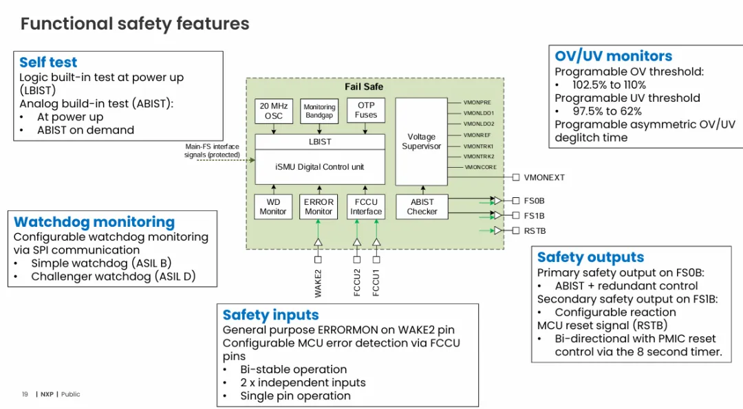 SPI接口按需触发;LBIST(逻辑内置测试)检测监控单元的逻辑电路完整性,覆盖组合逻辑与时序逻辑故障。