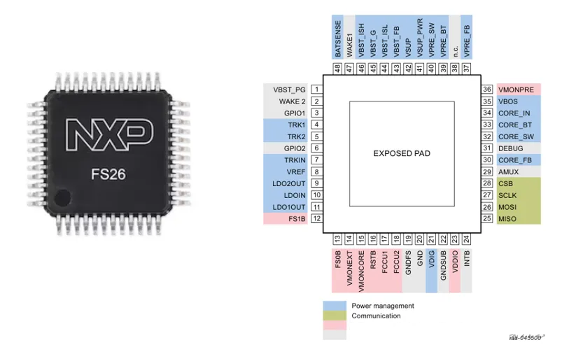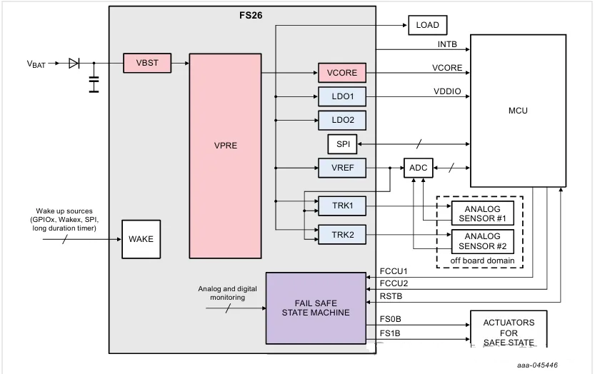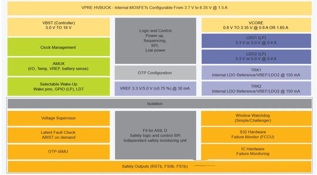 1)优势:FS26代表了PMIC的最新发展趋势,它不仅仅是一个电源芯片,更是一个“电源域控制器”。其极高的集成度和可配置性,允许系统设计师用一个芯片管理整个复杂域(如整个底盘域)的所有电源需求,包括主MCU、多个传感器、通信芯片、执行器驱动等。这极大地减少了外围器件数量、PCB面积和BOM成本。其内置的独立安全监控器(FSM)功能强大,可以分担主MCU的安全任务。