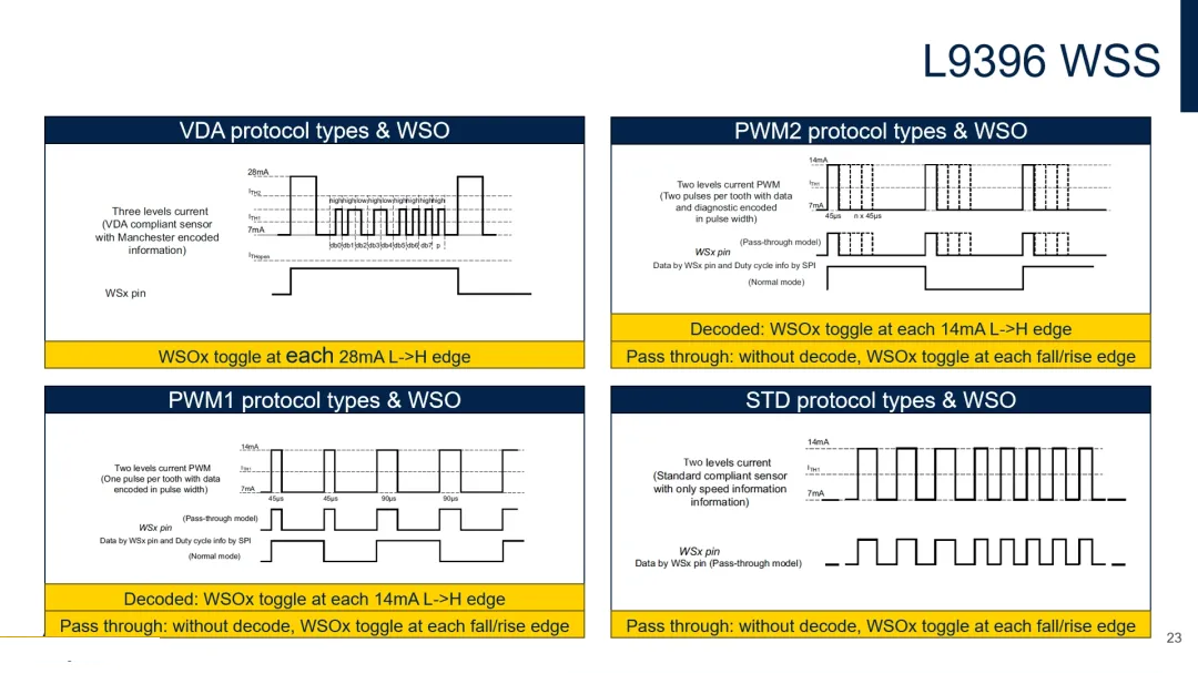 2)WSS接口集成是L9396的一大亮点,WSS接口都由Prebuck供电,支持多种格式的轮速传感器,集成了多种诊断和保护功能。