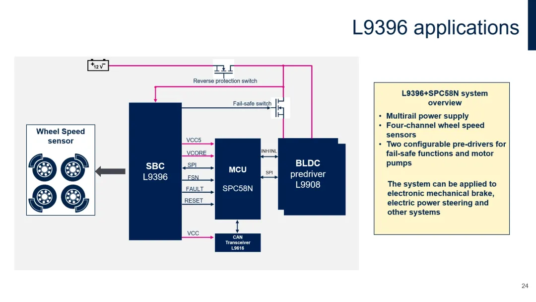 L9396是一款面向各种汽车电子应用的电源管理芯片,最高支持ASIL-D。它同样包含多路电源轨输出、多种系统监控,内部还集成了轮速传感器接口和有故障保护的驱动,尤其适用于线控底盘应用场景。