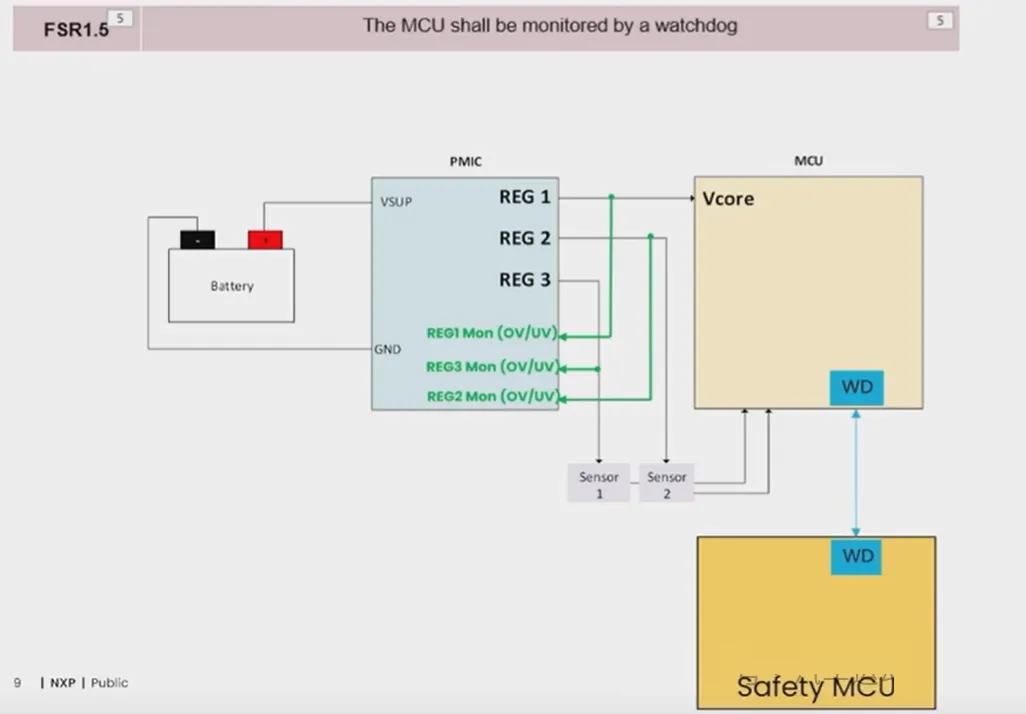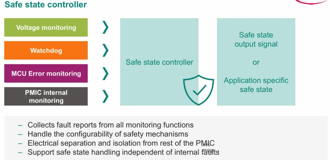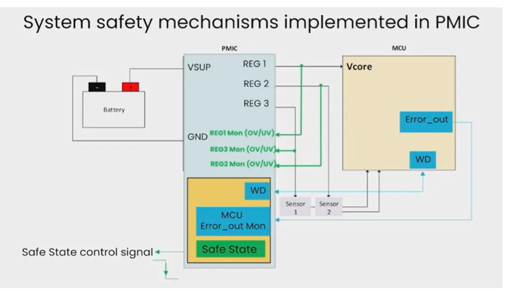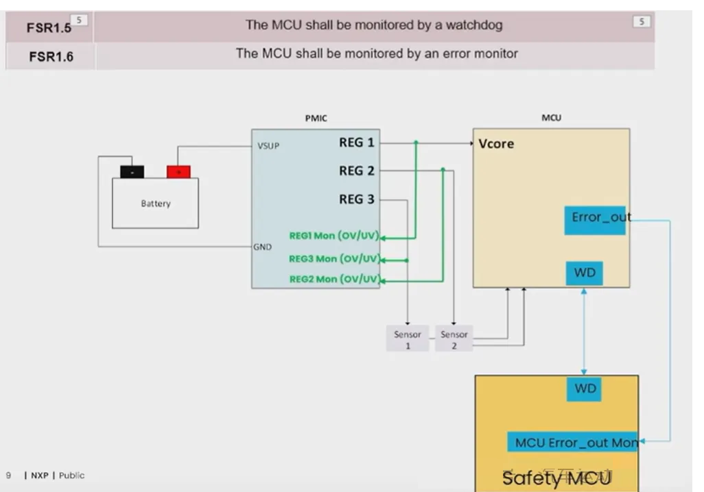 为了减少芯片数量,把以上四个FSR的功能安全要求实施通过一个PMIC电源管理芯片实现,如下图所示。相对于传统的电源管理芯片,目前主流的满足ASIL