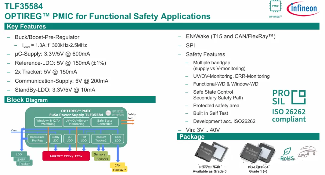 TC2xx/TC3xx系列MCU(尤其是带有独立安全岛的产品)搭配的“黄金组合”。如果系统安全架构要求必须有一个与主系统完全隔离的“安全岛”电源,TLF35584是首选。 |