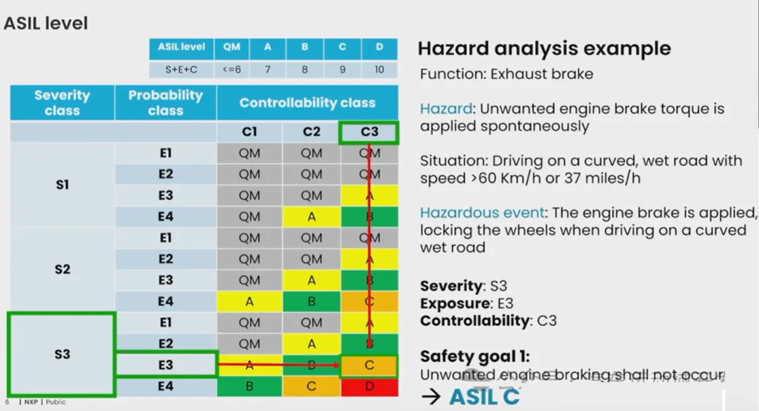 如下为针对排气制动功能,若出现非预期发动机制动导致湿滑弯道车轮锁死,其严重性为S3、暴露概率E3、可控性C3,对应ASIL