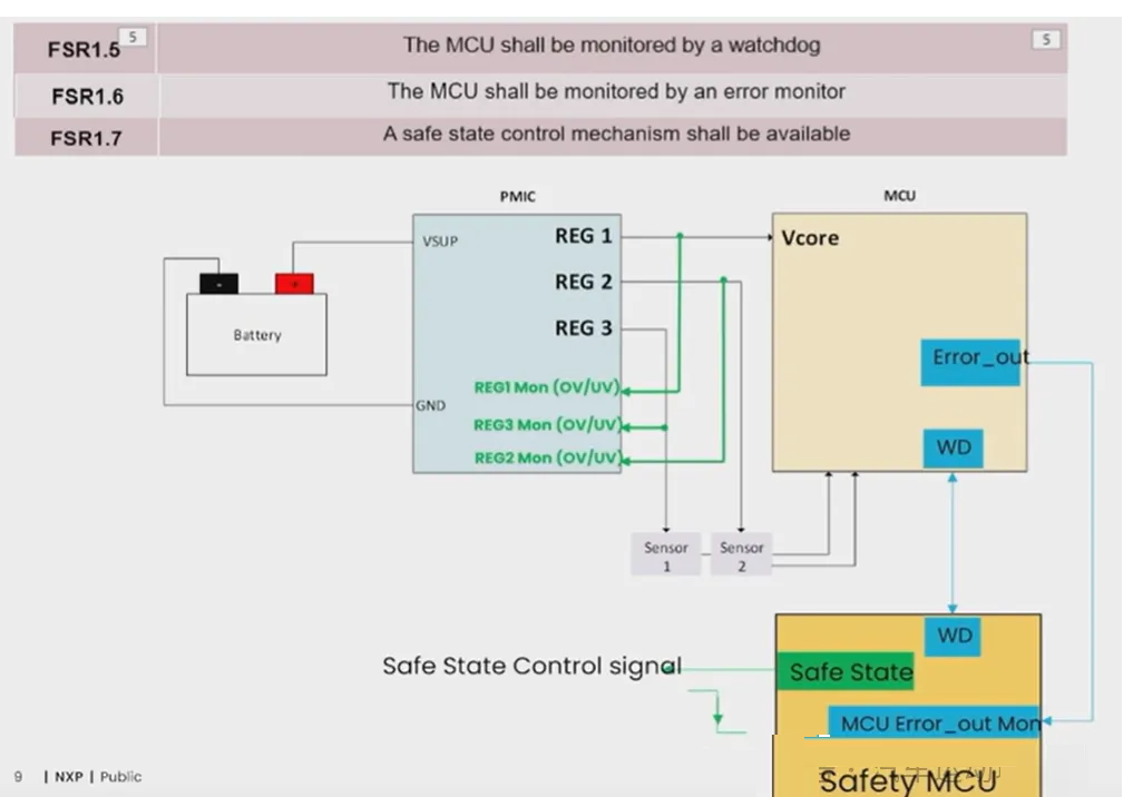 3. FSR1.6: 主MCU故障监控,当主MCU芯片出现故障时,需要有PIN脚发送故障信号给监控MCU,如下图所示: