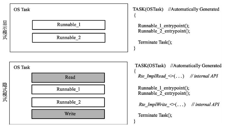 (2) 隐式模式(Implicit Mode):当多个运行实体需要读取相同的数据时,若能在运行实体运行之前,先把数据读到缓存中,在运行实体运行结束后再把数据写出去,则可以改善运行效率。
