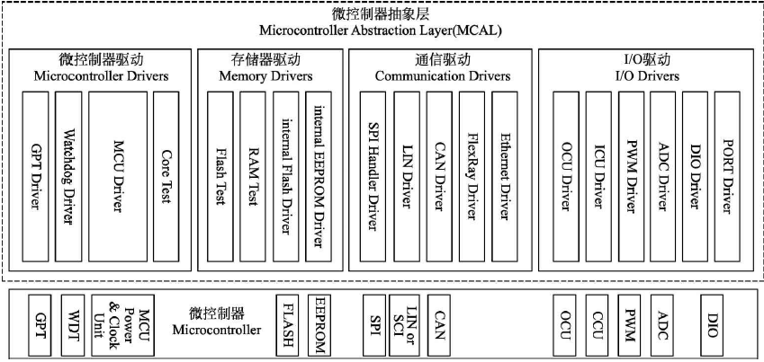 微控制器抽象层(Microcontroller Abstraction Layer,MCAL)是实现不同硬件接口统一化的特殊层。通过微控制器抽象层可将硬件封装起来,避免上层软件直接对MCU寄存器进行操作。