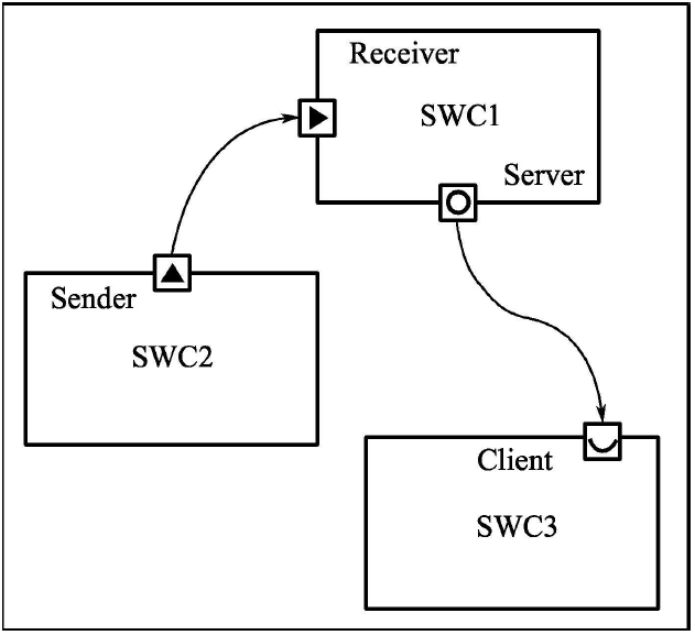 如下图,软件组件SWC1有2个端口:一个引用的端口接口类型为发送者-接收者(S/R)接口,另一个引用的端口接口类型为客户端-服务器(C/S)接口。