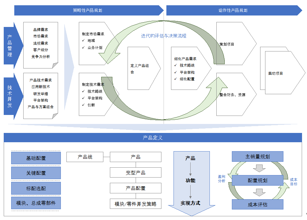 综上,产品定义过程可以简单描述为:以产品规划为输入,定义出产品开发项目所需要开发的产品组合、变型产品、配置清单以及模块/零部件清单。这一过程回答了新产品开发项目要开发什么产品(平台架构特性、关键配置组合形成的变型产品)、具备哪些功能(配置,一般以特征族/特征值来表达)、采用什么方式实现(模块/零部件)等关键问题。