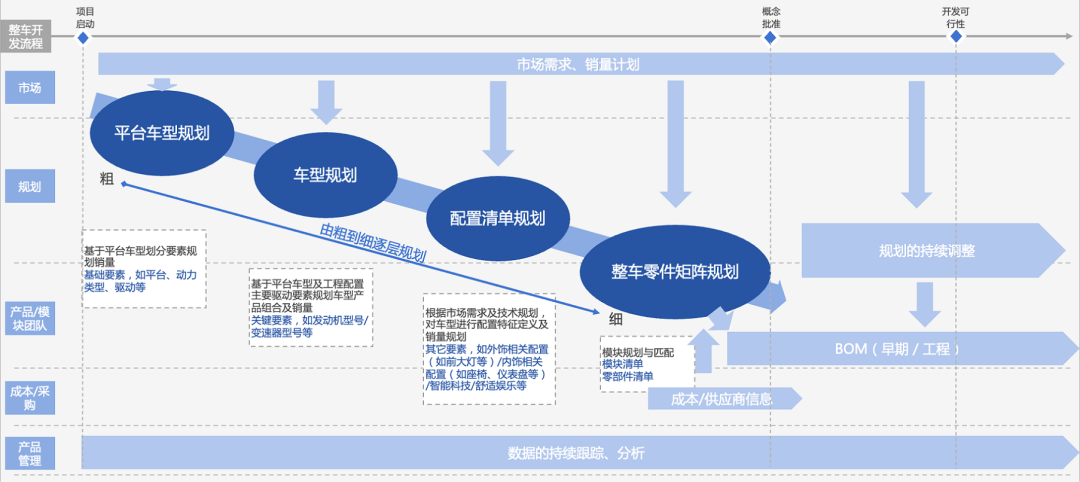 产品定义过程前面已详细描述,从平台车型规划、变量车型规划、配置清单规划到整车零件矩阵规划,按四个步骤进行,兹不赘述。