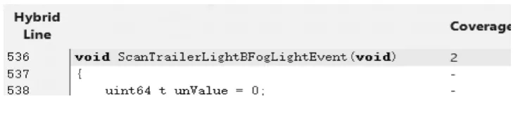 通过调用覆盖率、函数覆盖率可以证明函数之间接口可以正常调用,没有出现函数异常调用。当LightTrailer.c中所有功能执行完成后,调用覆盖率和函数覆盖率预期为100%。