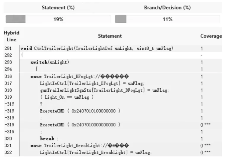 CtrlTrailerLight函数的语句覆盖报告如图9所示,其实际执行次数为1次,符合预期结果。其中拖车后雾灯驱动开启指令ExecuteCMD(0x2-
