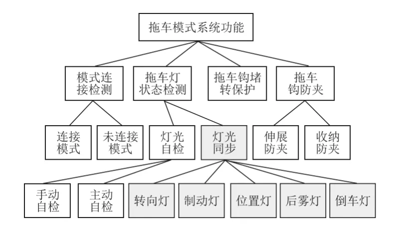 本文将拖车控制器软件功能划分为四个层级,如图1所示。拖车模式功能项作为顶层功能模块,在此基础上合并需求中的独立条目,划分第二层级的小功能项:模式连接检测、拖车灯状态检测、拖车钩堵转报保护、拖车钩防夹;第三层级以同类型的多个操作项作为一个任务集合;第四层级参照实车测试,以能够组成一个独立可观测的行为作为最小颗粒度功能。本文选择灯光控制相关的五个功能场景开展测试,并且将根据上述功能层级划分情况设计具体的测试用例。