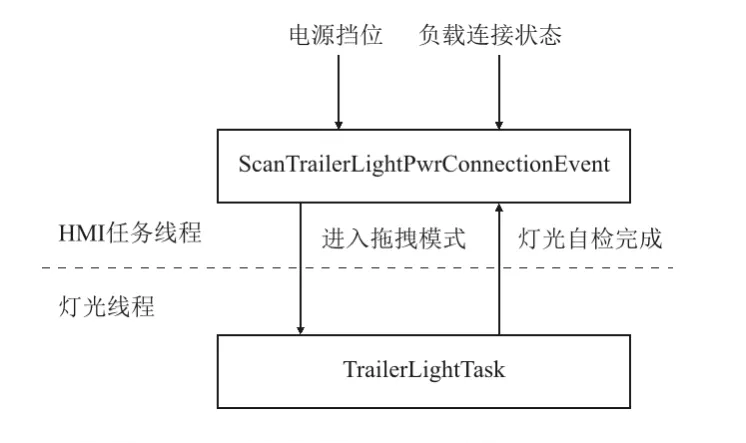 Interaction, HMI)任务线程和灯光线程。其中,HMI任务线程负责拖车模式判断和灯光同步,灯光线程负责灯光自检。具体运行过程如图2所示,HMI任务线程通过扫描接口连接事件判断是否进入拖车模式,并在获取到进入拖车模式事件后发出“进入拖车模式标志位”;灯光线程扫描到该标志位后立即开始灯光自检任务,并在自检完成后发出“灯光自检完成标志位”;当HMI任务线程扫描到该标志,则进入灯光同步任务。