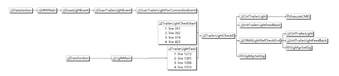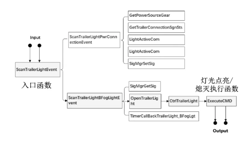 如图4所示,后雾灯同步模块涉及5个函数(置灰部分),其中ExecuteCMD函数位于驱动程序中,其余4个分布在LightTrailer.c文件中。