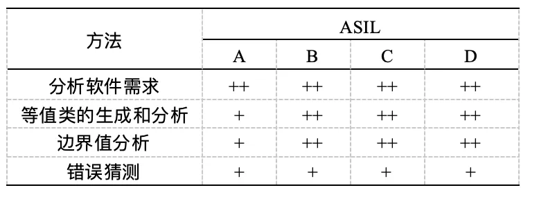 注:ASIL(汽车安全完整性等级, Automotive Safety Integrity Level);“++”表示该方法强烈推荐用于已识别的ASIL等级;“+”表示该方法推荐用于已识别的ASIL等级。