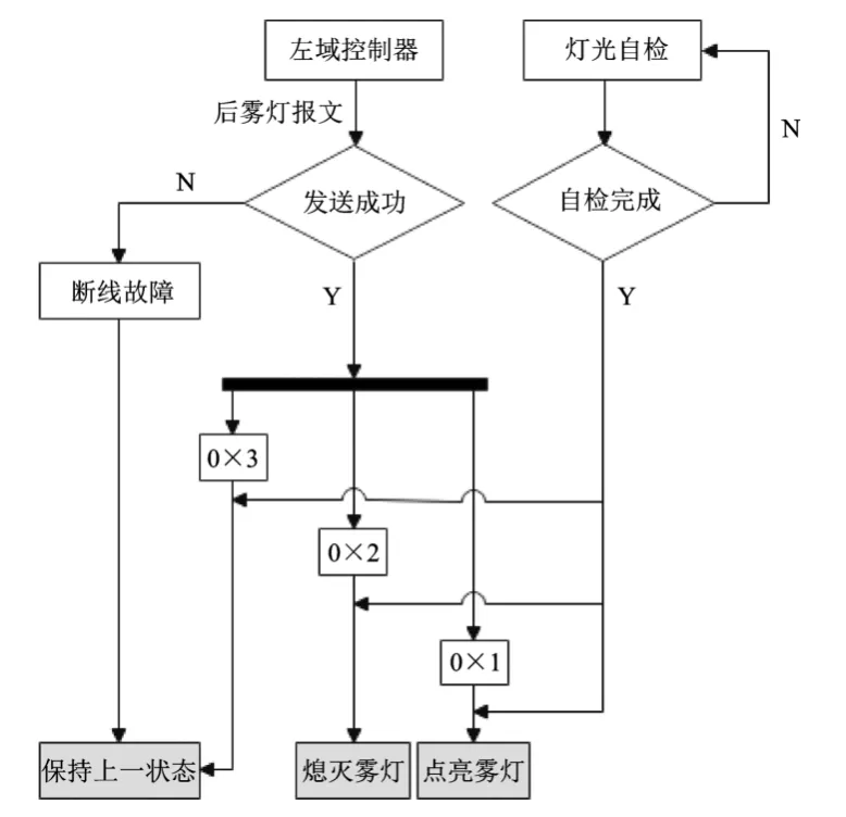 tr2:灯光自检完成,拖车控制器收到左车身控制器的后雾灯点亮报文,控制拖车后雾灯点亮;
