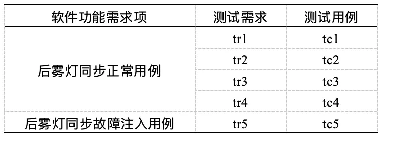 通过分析后雾灯同步的软件需求,形成5条测试需求(tr):