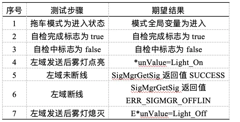 407010100000000)语句执行1次,拖车后雾灯驱动关闭指令ExecuteCMD (0x2407010000000000)语句执行0次。这表明左车身控制器断线以后,控制后雾灯保持点亮,所以用例tc5执行结果符合预期,测试需求tr5验证通过。当所有用例执行完成后,后雾灯灯光同步的控制逻辑这条软件需求覆盖率应该达到100%。