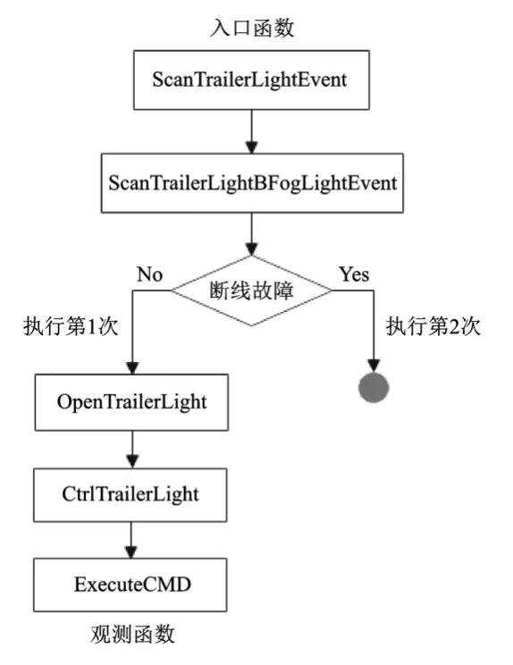 灯光同步任务与转向灯、制动灯、位置灯、后雾灯和倒车灯等5个灯光模块相关,且均被拖车灯光事件扫描函数ScanTrailerLightEvent调用。所以本文将ScanTrailerLightEvent函数作为灯光同步的公共入口函数,测试某个灯光模块时将其余四个模块被调函数全部打桩。以后雾灯灯光同步模块测试为例,为了层层调用相关函数执行测试,在Testbed软件中对扫描后雾灯光事件函数ScanTrailerLightBFogLightEvent、打开拖车灯动作函数OpenTrailerLight以及灯光控制逻辑函数CtrlTrailerLight均不打桩,最终通过ExecuteCMD函数调用不同参数来实现灯光点亮和熄灭。通过分析确定了后雾灯模块主要的调用路径,同时也是功能是否被成功实现的观测路径,如图4所示。