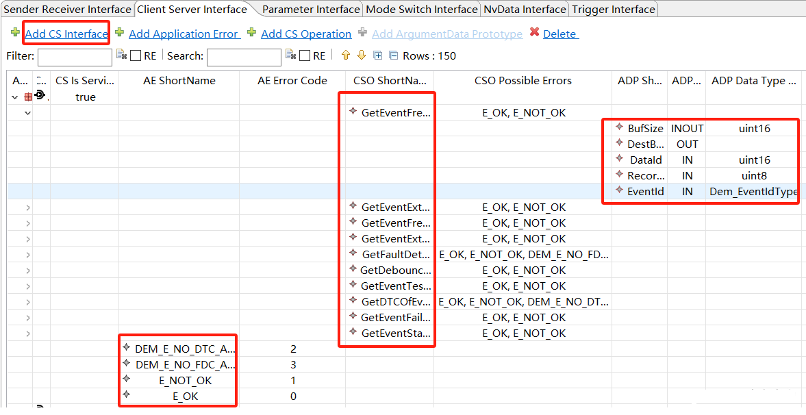 下图包含了一组函数原型集合的C/S接口,并打开了一个函数的参数,包含BufSize等。增加C/S接口则点击Add