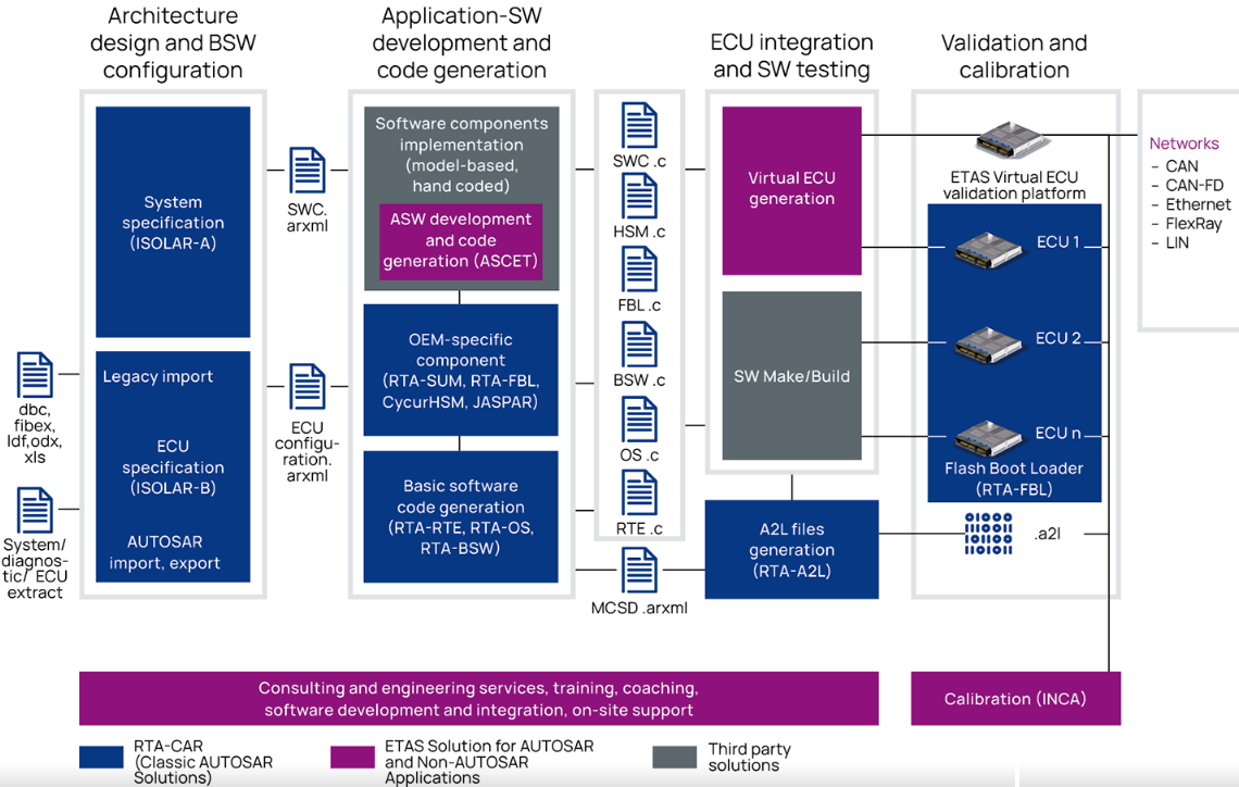 ETAS RTA-CAR(Classic AUTOSAR)包括用于ECU软件开发的基础软件模块和工具,主要内容如下: