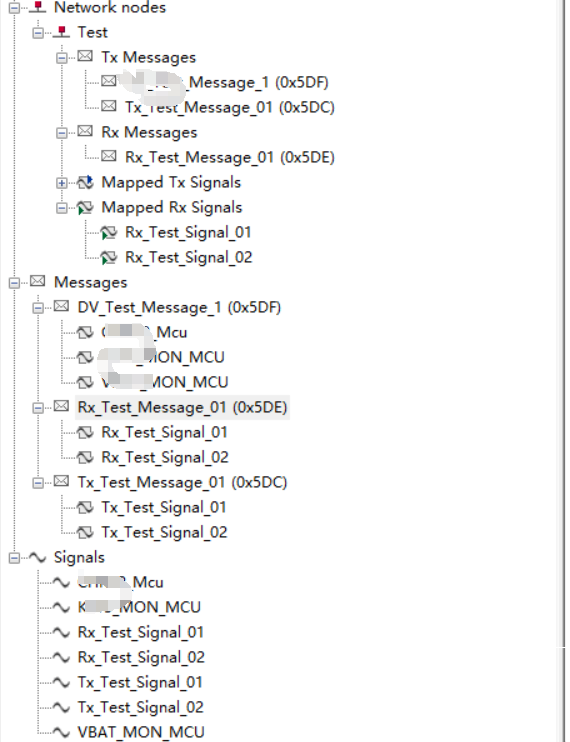 Messages即可;若报文时接收的,则需要拖动该报文的信号,将他们逐一添加到Mapped Rx Signals列表中,下图是两个Tx报文和一个Rx报文。
