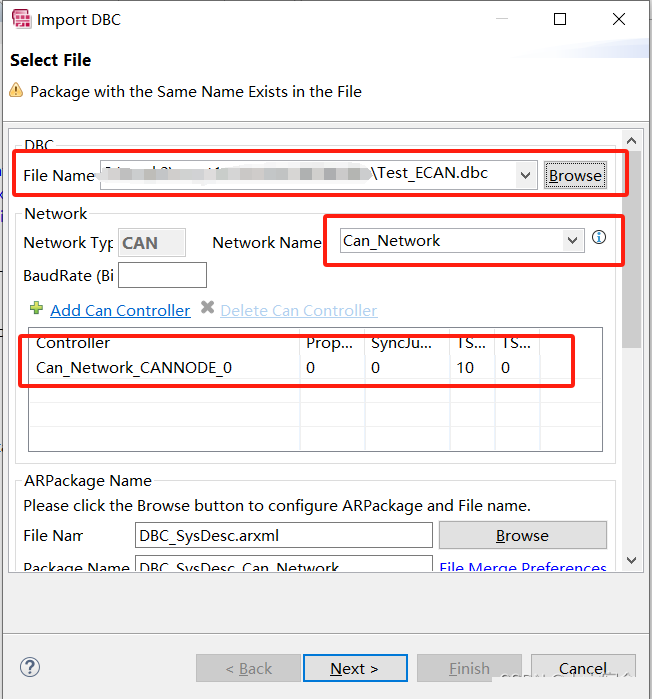 然后进入如下界面,选择要导入的dbc文件,和导入的CAN网络与对应的CAN控制器。