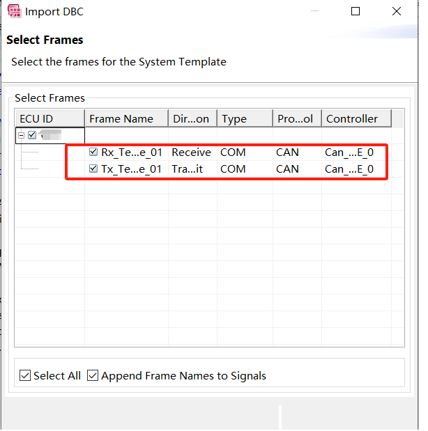 然后选择DBC中要导入的ECU。