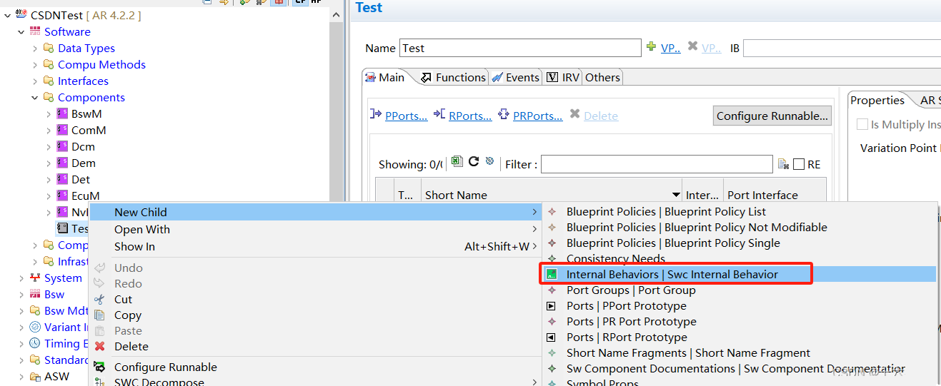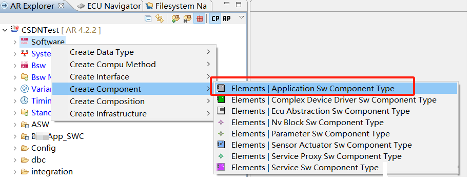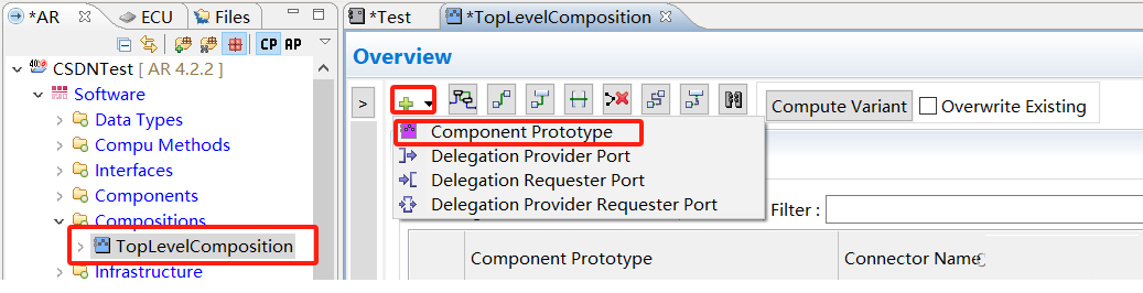 部件(Composition)是软件组件的集合,它包含一组相关甚至整车的所有ECU的软件组件,下图是部件的建立方法。