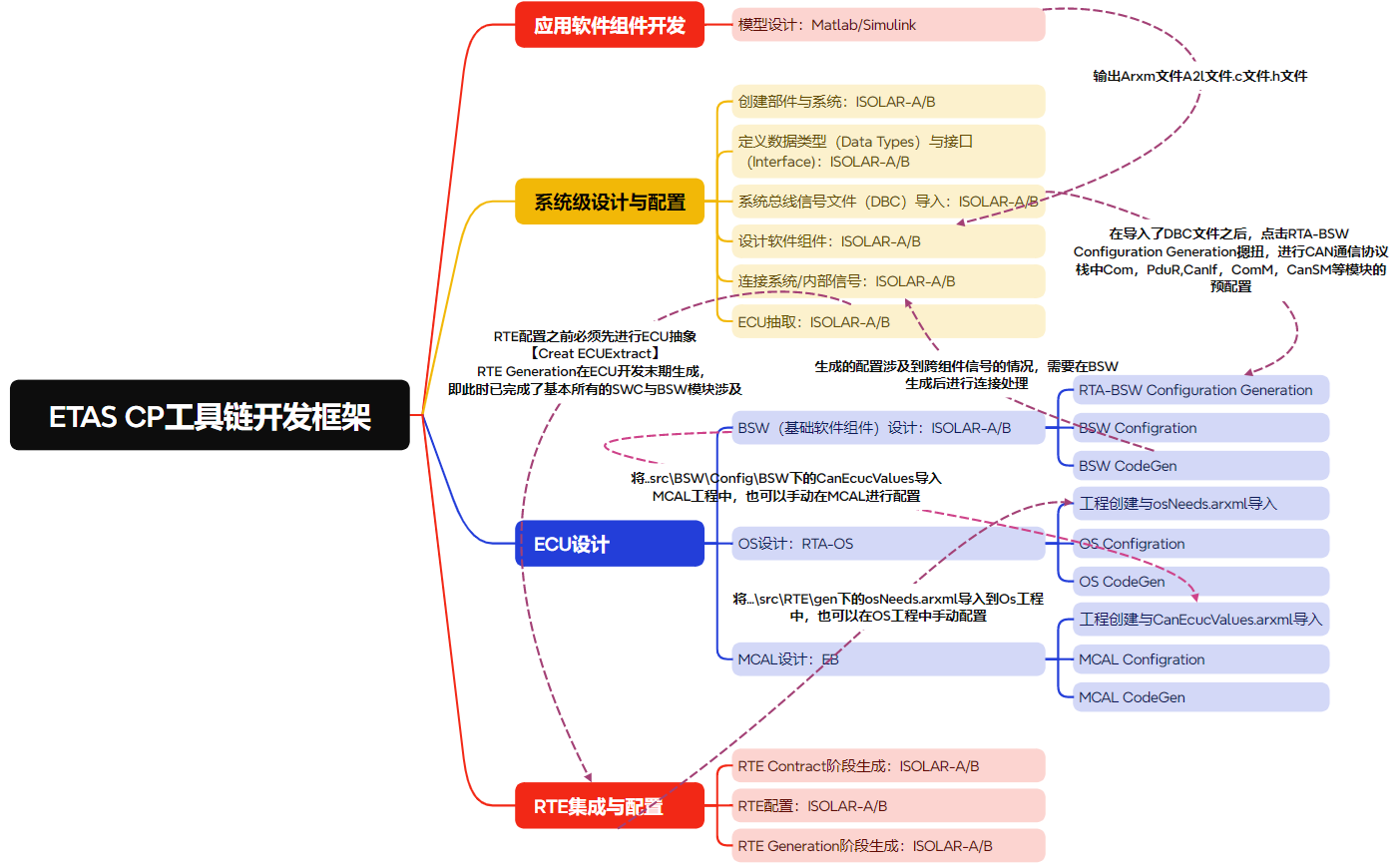 下面的脑图包含了使用ETAS CP工具链进行开发的一个基本框架,其中把整个ECU的软件开发设计分为了软件组件开发、系统级设计与配置、ECU设计、以及RTE集成与配置。其中应用软件组件开发主要着眼于控制逻辑以及算法的开发,系统级设计与配置主要着眼于组件(包含应用以及基础软件组件)之间的关系设计,ECU设计主要着眼于基础软件组件,OS,以及底层驱动的设计与实现,RTE的集成与开发则着眼于根据系统级设计完成组件间通信以及任务调度。