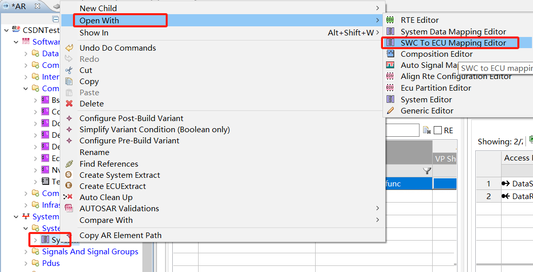 然后右键之间建立的系统,打开方式选择SWC To ECU,然后拖拽到ECU之下。