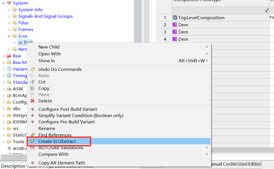 在生成RTE之前,需要做ECU抽取来把BSW和ASW的改动跟RTE相关的部分抽取出来。选择对应的ECU,右键选择建立ECU抽取。