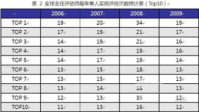 在研讨会上发布的2006年以来每年评估师实施正式评估数量Top10的数据(具体参见表2)和演讲中披露的评估结果报告系统(SAS)中发现的众多问题——与会同行对评估数量的激增和评估质量的担心都可见一斑。尤其是2008年某位主任评估师完成正式评估数创下了高达34次的“记录“,被与会同行反复提及。