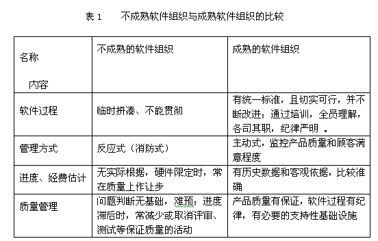 表1给出了不成熟和成熟软件组织的比较,这种比较分析不仅是形成软件能力成熟模型的基础,也有利于理解该模型。