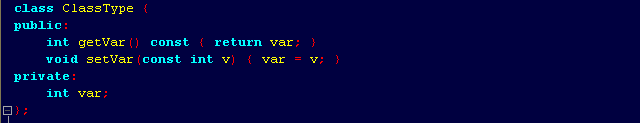 他们很少在类的定义中嵌入内联函数,我看到的唯一一次是代码和函数声明写在了同一行,这种做法有点不符合规范。这种类定义的组织方式非常容易解析,不过需要更多的时间来编写。