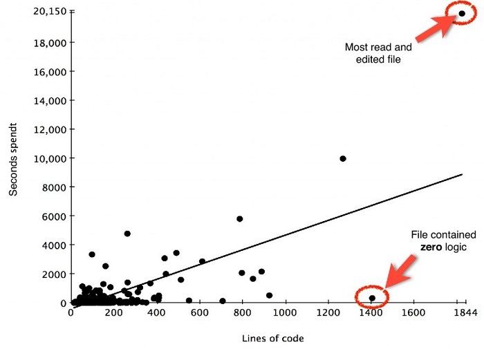Y轴代表在项目维护期间花费在阅读修改一个文件上的时间;X轴代表文件的大小。