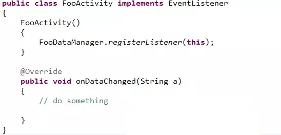 如下面的代码所示,FooDataManager一般都会用一个列表来存储注册的监听者,如果FooDataManager需要运行很长时间甚至整个生命周期,或者listener本身是一个静态对象的话,那么listener会长期存在于内存中,这意味着listener中存放的对象也会被长期持有,最终导致内存泄漏。